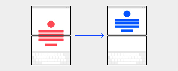 比如你的应用原本是为竖屏设计的,但是需要经常输入内容,那么你要考虑到双屏设备上,你的应用可能是会被横屏显示,用户会像用笔记本电脑那样来使用应用,也就是说两块屏幕都横向显示,靠下平摊在桌面的屏幕会显示虚拟键盘或者手写区域,作为输入窗口,而显示窗口也是横向的。