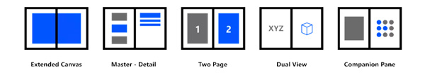 在为双屏设备设计应用的时候,有四种常见的布局方案是你需要考虑的。通常这取决于应用是单屏还是跨屏,是默认视图还是全屏视图: