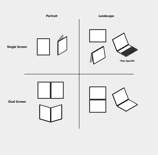 双屏设备可以基于不同的工业设计,有多种硬件样式。微软发布的 Surface Neo 和 Surface Duo 可以作为典型的双屏设备作为参考。双屏本身可以借由铰链、转轴来连接,也可以基于柔性屏来实现。