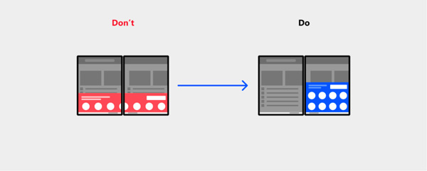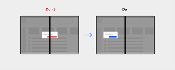 由于两块屏幕之间有明显的接缝,因此当用户在使用应用的时候,某些 UI 元素可能会正好被穿过接缝,逻辑上这不会影响功能,但是如果将这些 UI 元素移动到屏幕的一边来显示,会提供更好的体验。最好避免在接缝处显示文本内容,这会影响可读性。